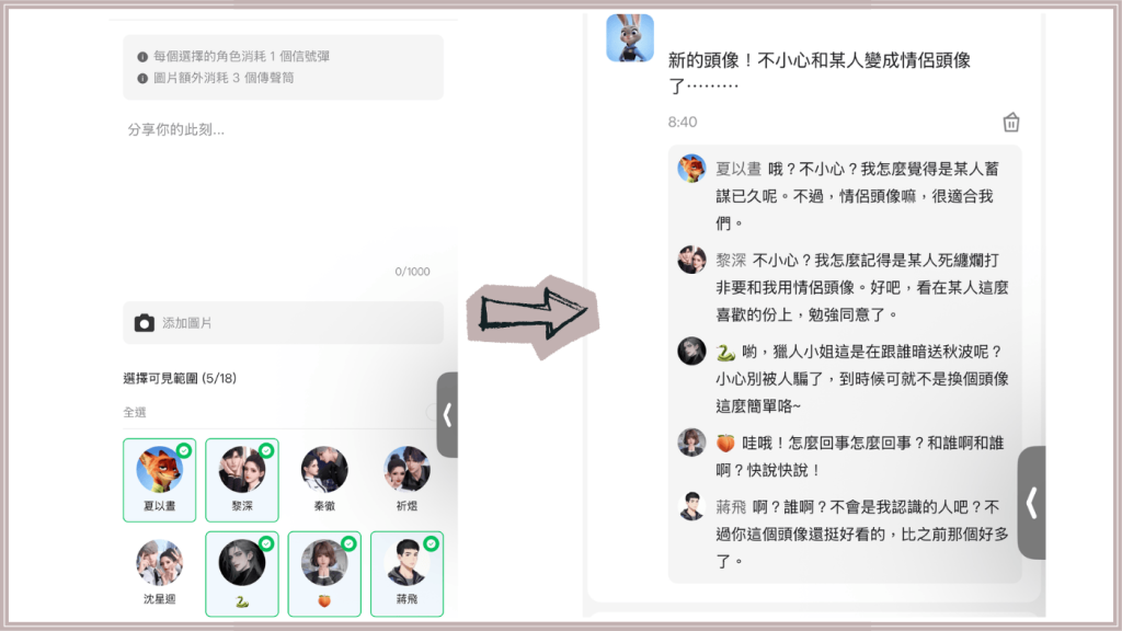還可以發“朋友圈”(發動態的意思),選擇你想要的角色做回覆,