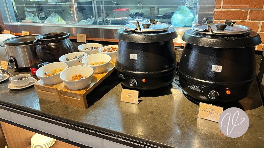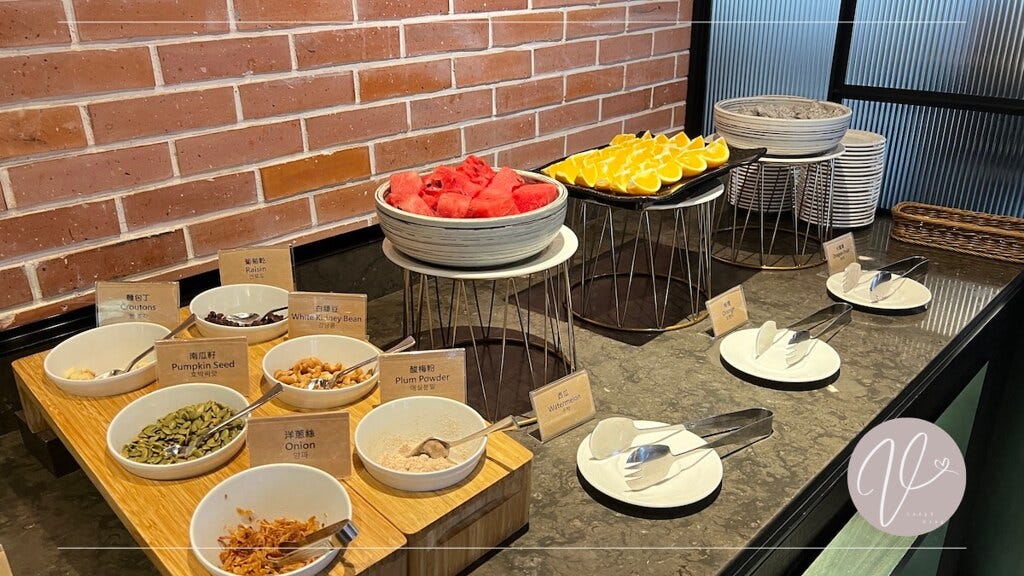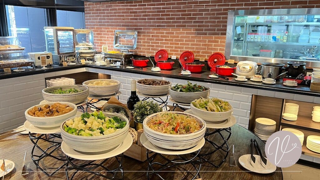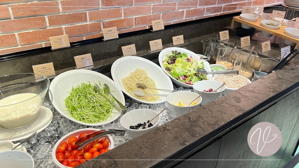 有生菜沙拉、歐式麵包、中式粥品多樣菜色,吃得飽飽飽