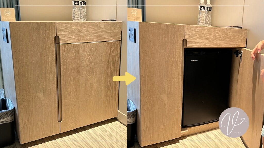 冰箱嵌在小櫃子裡,有附兩瓶水和一些沖泡包。
