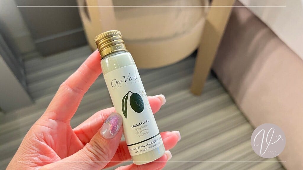 沐浴用品使用義大利製造的橄欖山莊(Oro Verde),雖然之前沒聽過這個牌子,沐浴乳洗起來還算是OK(我有異位性皮膚炎,洗澡都會避開容易復發處),洗髮精就可以Pass,用自己的就好。