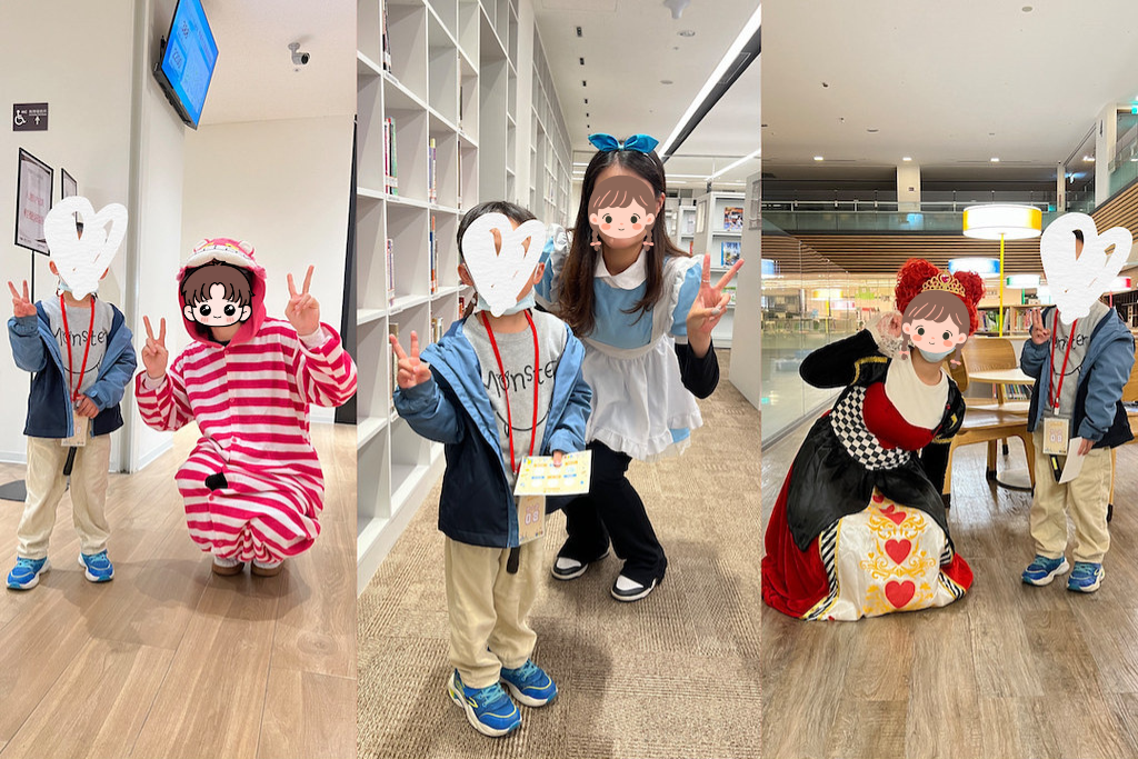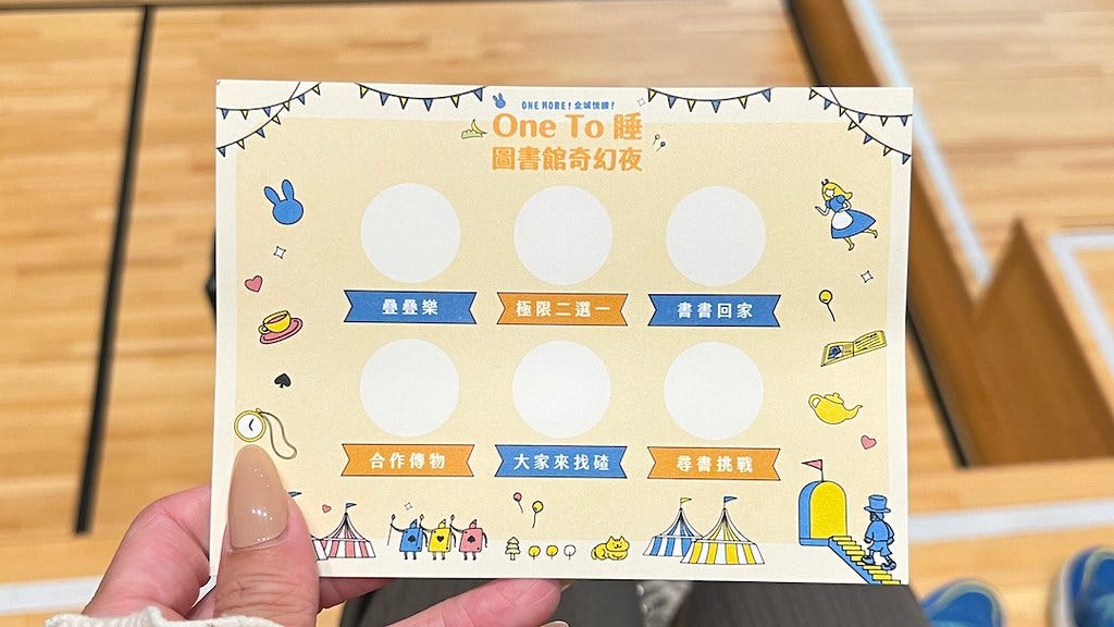 小朋友在晚上的圖書館玩闖關開心得很,闖關當中還要找找隱藏在各樓層的愛麗絲夢遊仙境裡的人物,