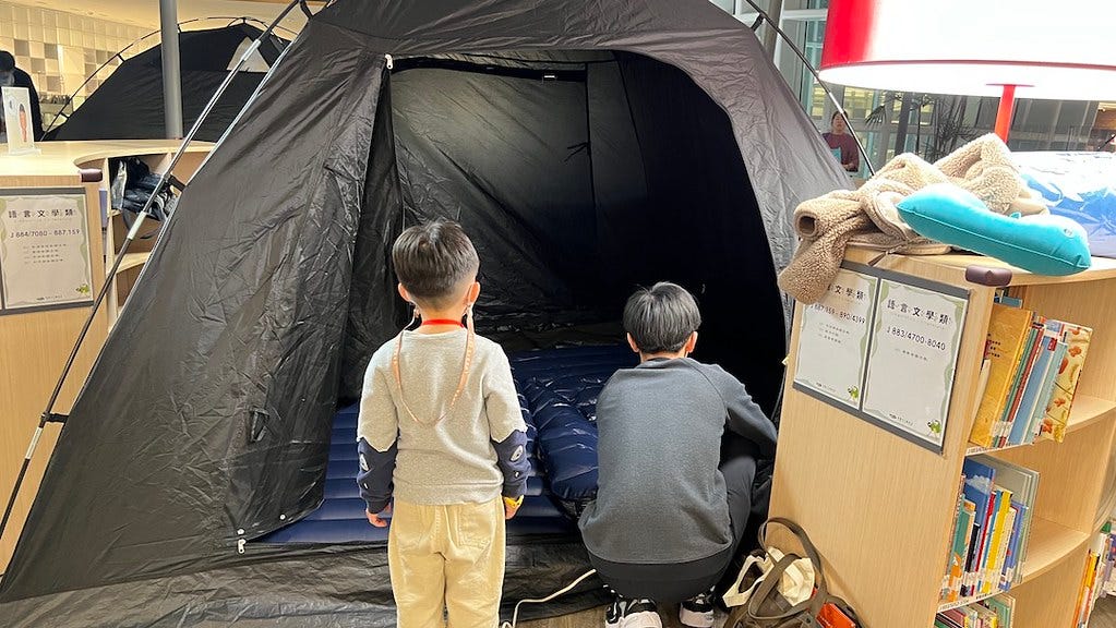 因為我們的帳篷是在一個書櫃區,空間有限,