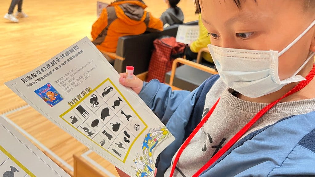 說故事時還有賓果可以玩,在螢幕上找到的物品可以在賓果紙上做記號,連線的話就可以拿小禮物。